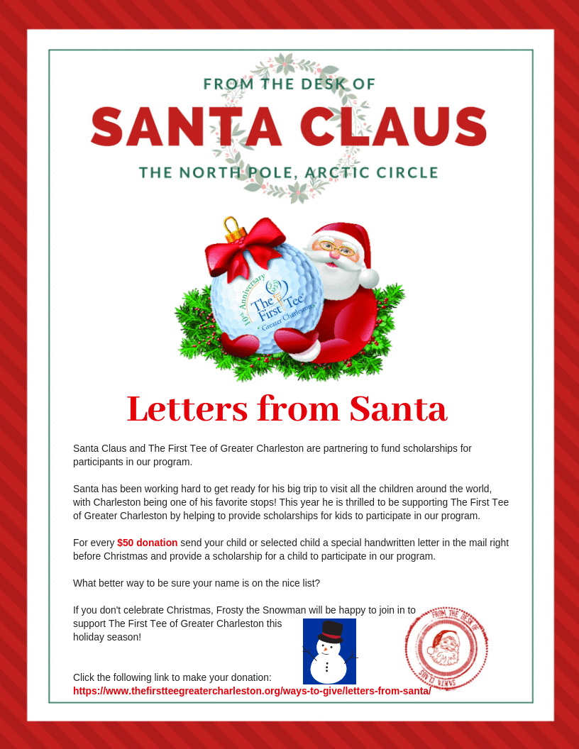 Santa Claus and The First Tee of Greater Charleston are partnering to fund scholarships for participants receiving financial aid in The First Tee program.